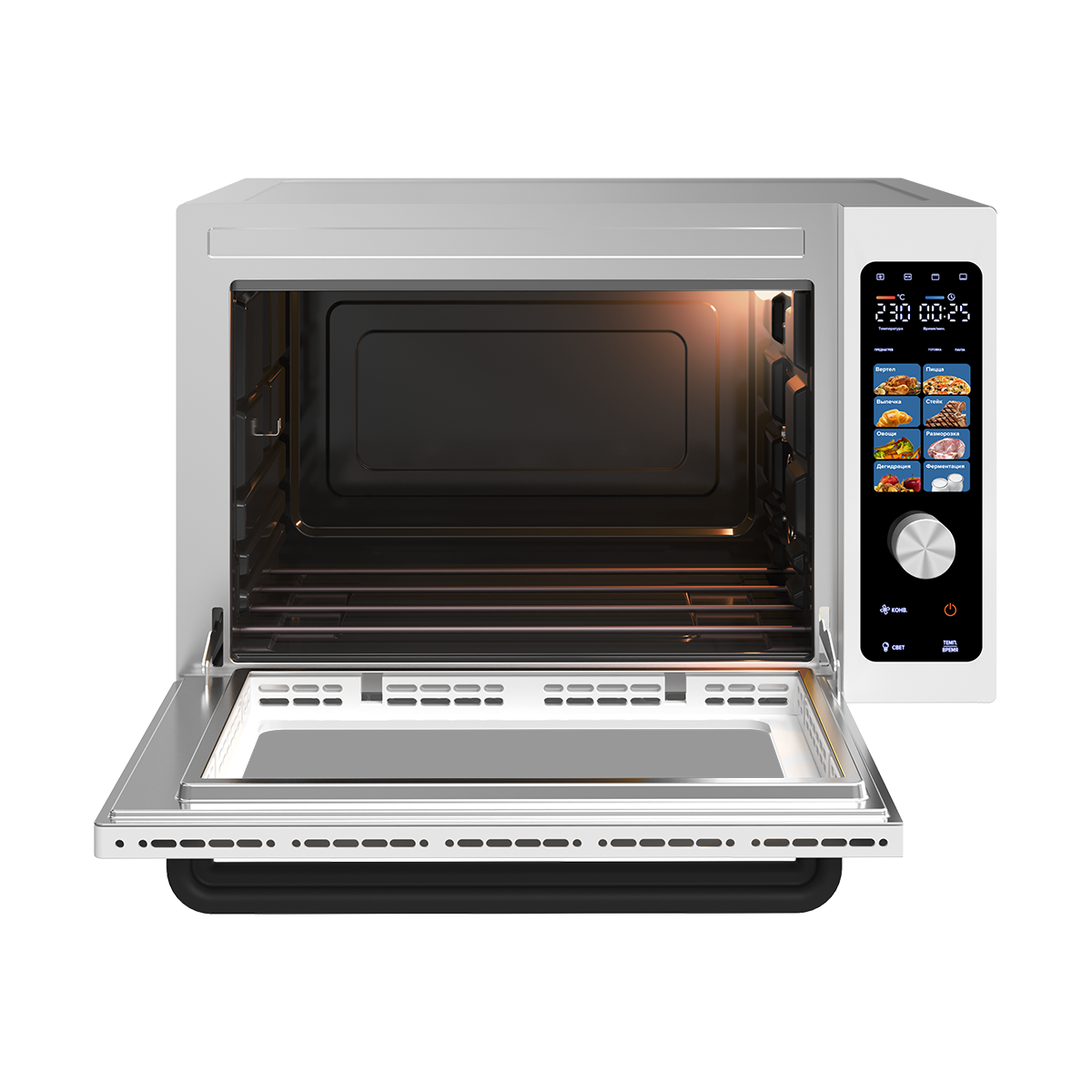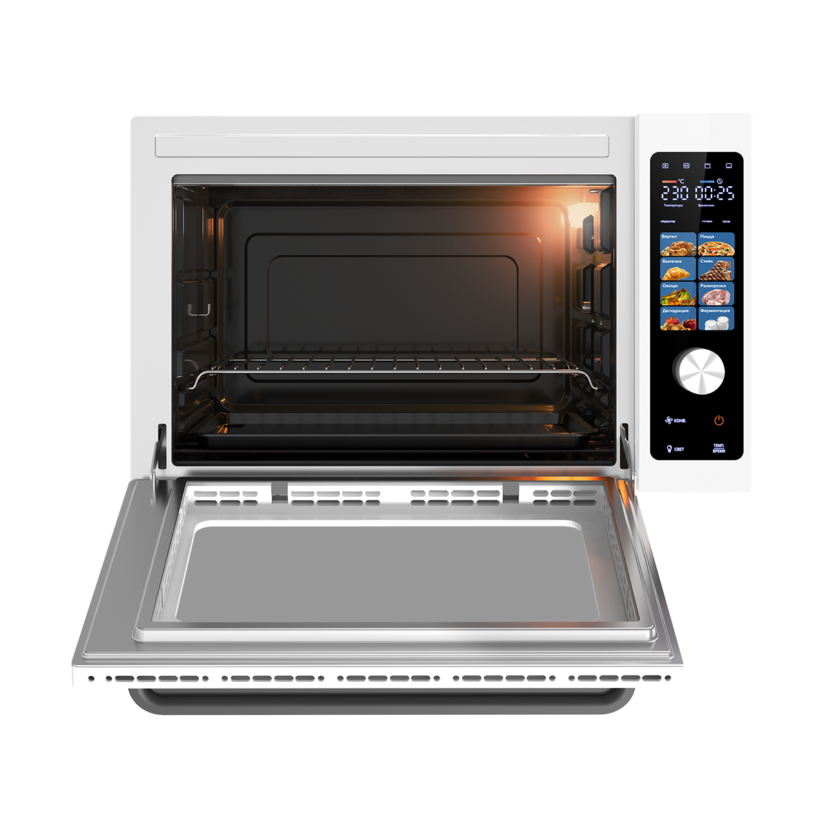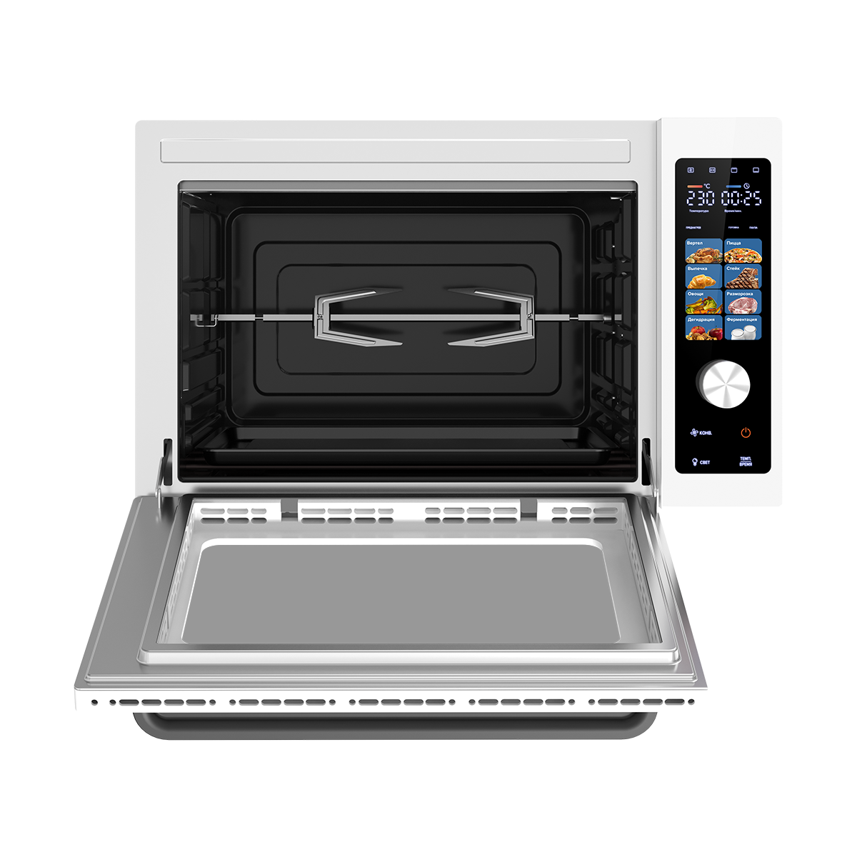 звуковой таймер, конвекция, съемный поддон для сбора капель, встроенное освещение, набор для гриля