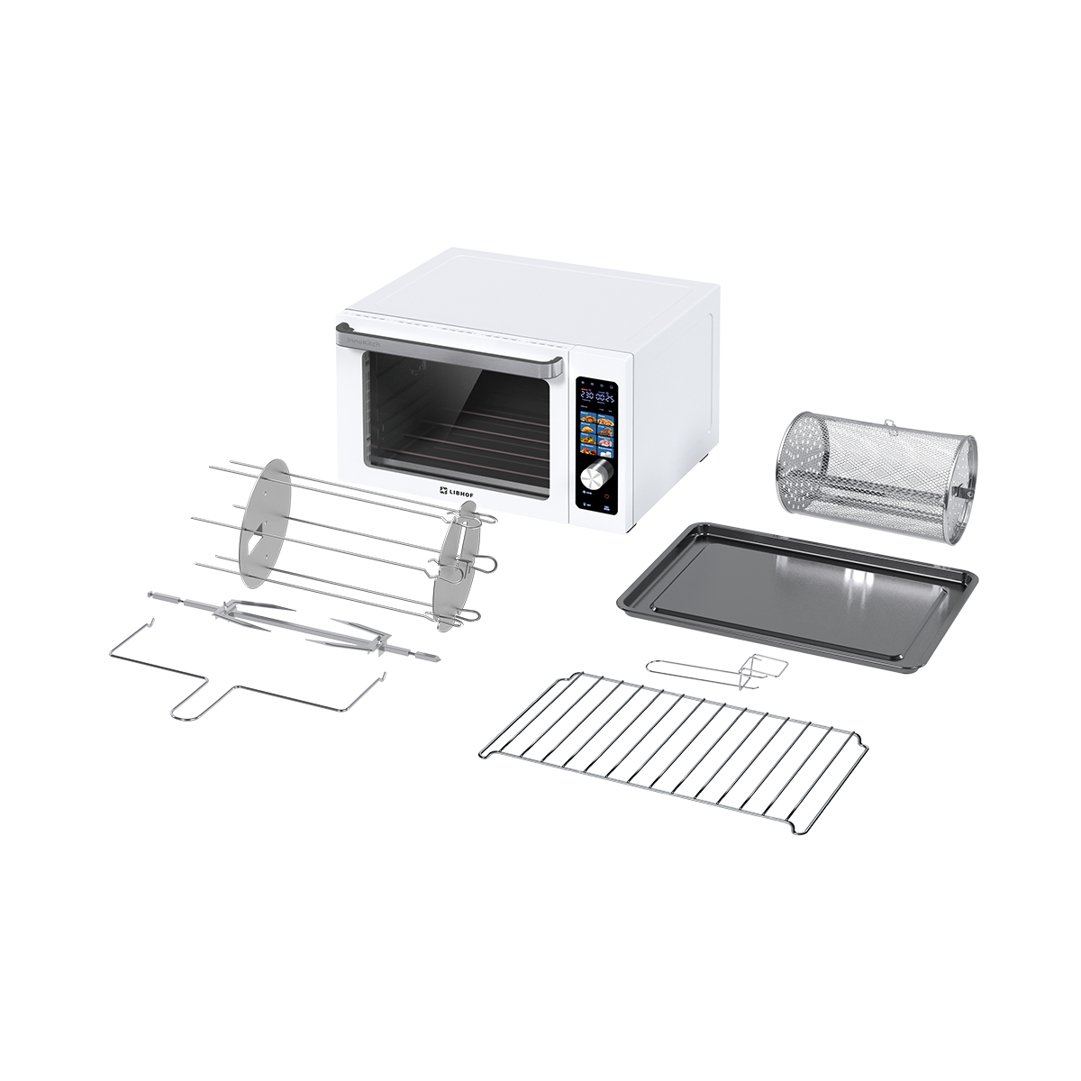 Мини-печь, набор для гриля, противень для выпечки, решетка, ручка для подноса, вращающаяся корзина, вилка для барбекю, поддон для крошек, инструкция, книга рецептов