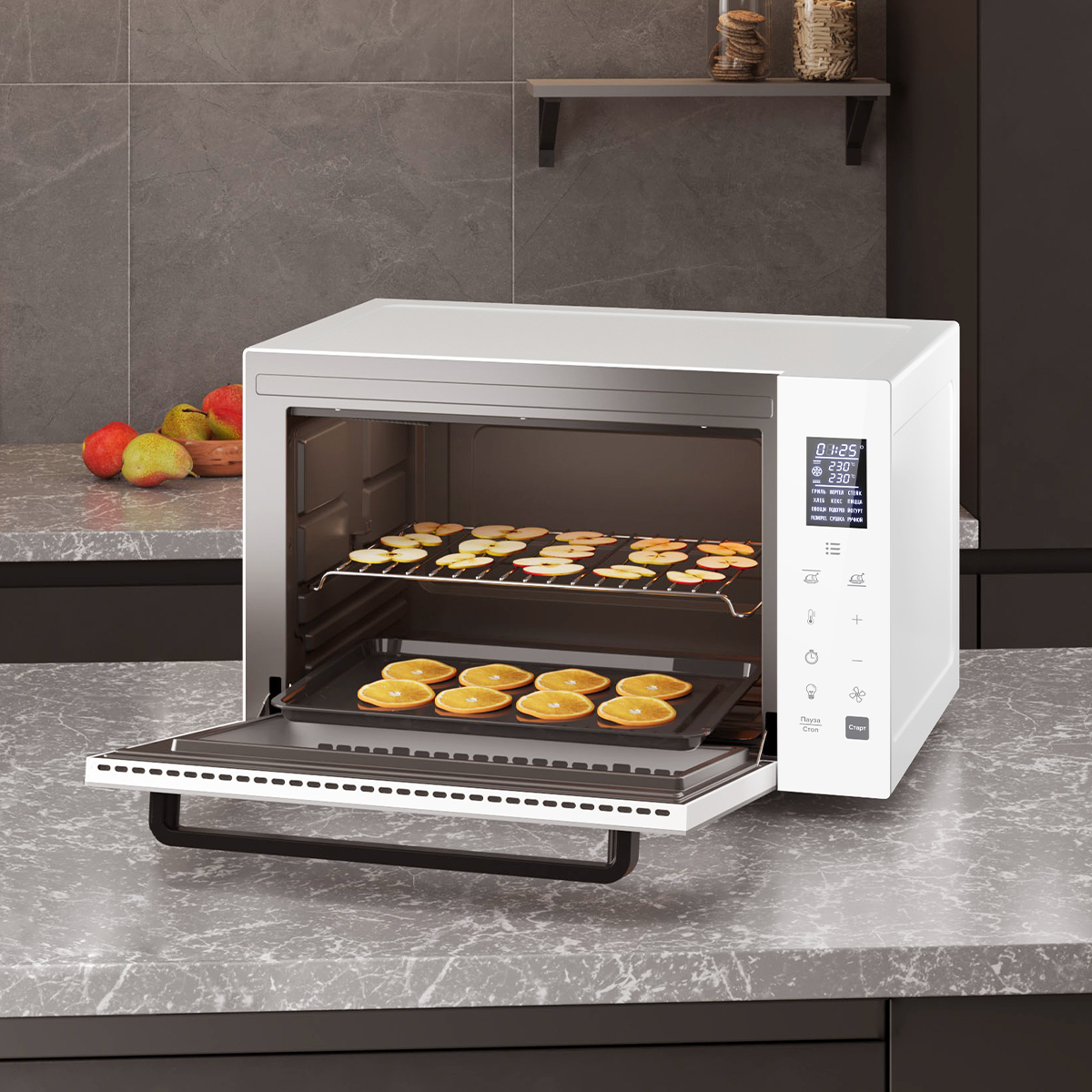 Отличная альтернатива полноценной духовки. Спокойно помещается целая курица на вертеле или противень с овощами. Конвекция работает отлично, всё пропекается равномерно, ничего не приходится переворачивать. Приятно удивил режим ферментации — делаем домашний йогурт, получается вкусно. Покупкой очень довольны.