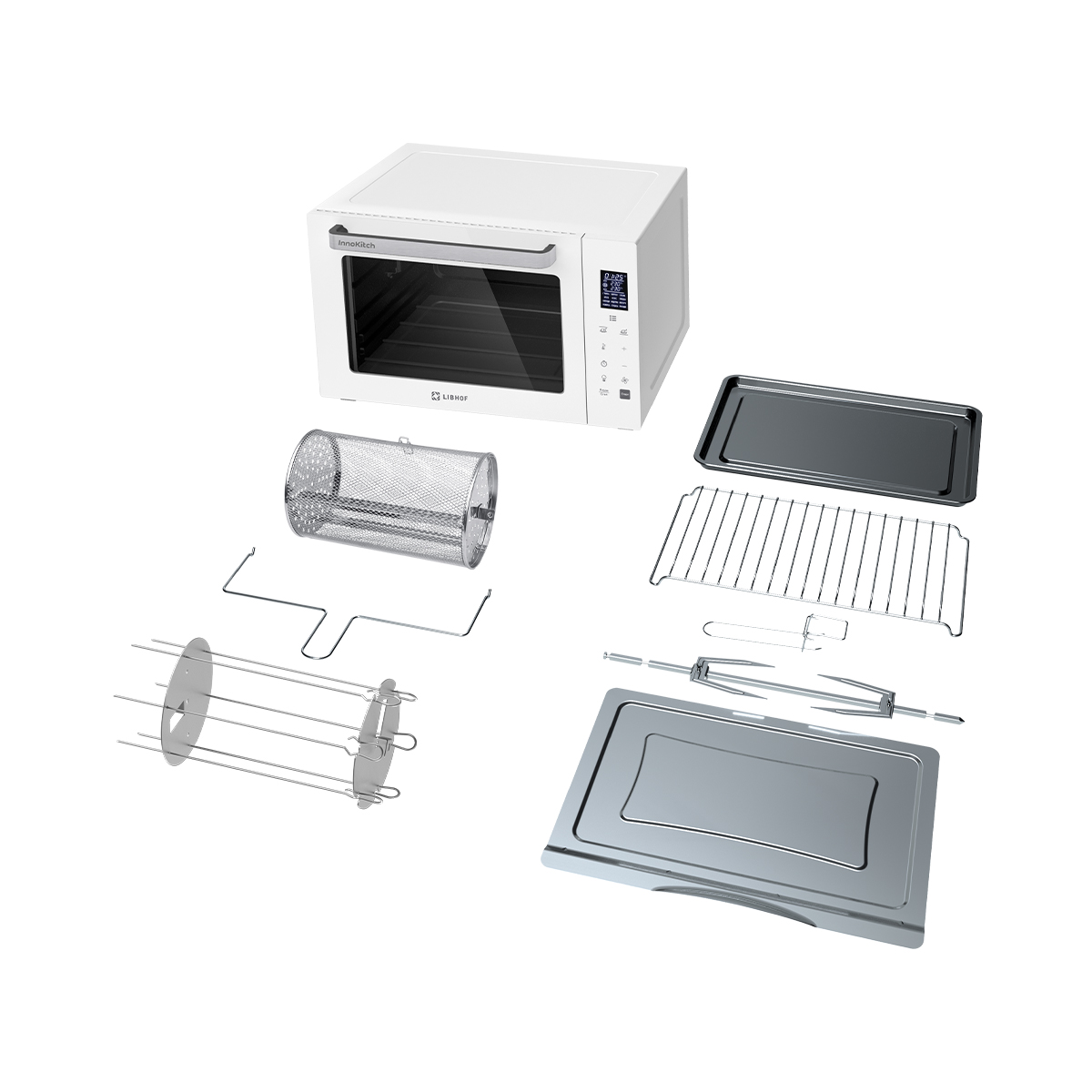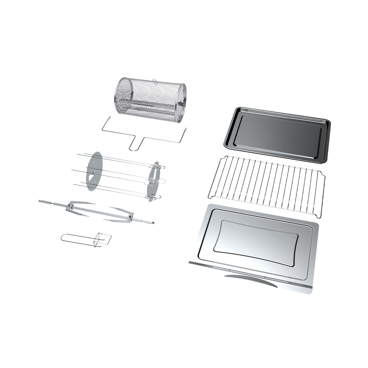 Мини-печь, набор для гриля, противень для выпечки, решетка, ручка для подноса, вращающаяся корзина, вилка для барбекю, поддон для крошек, инструкция, книга рецептов
