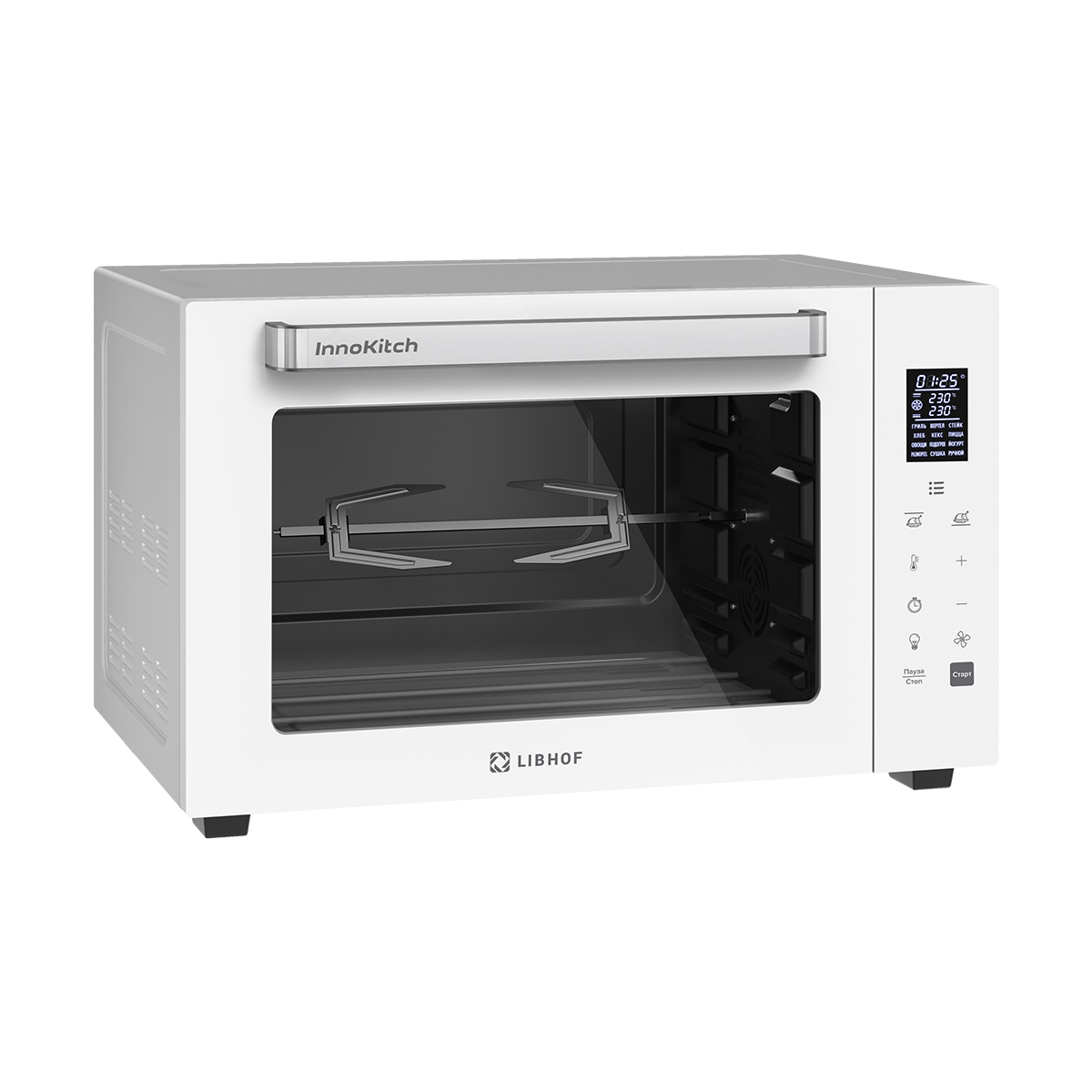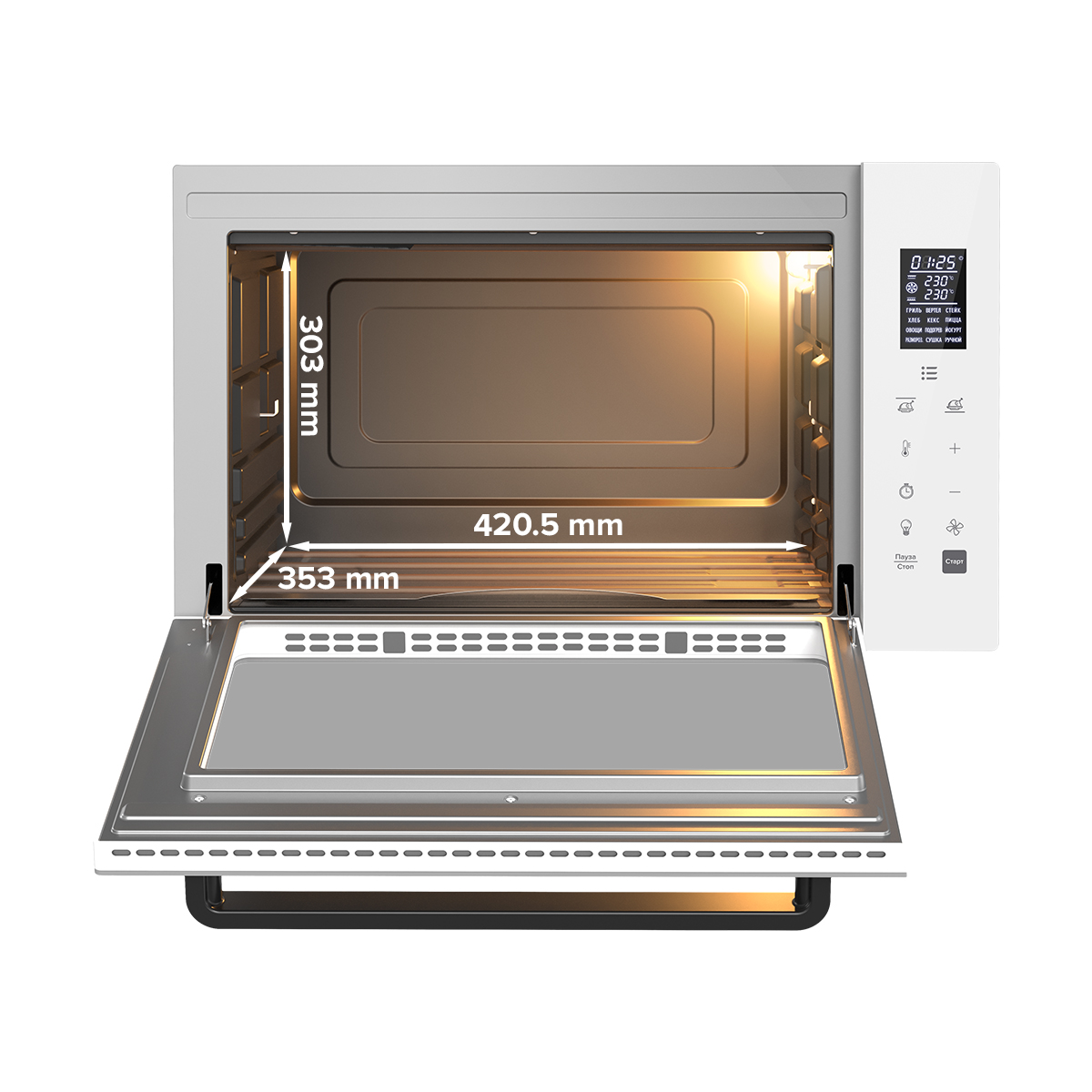 звуковой таймер, конвекция, съемный поддон для сбора капель, встроенное освещение, набор для гриля