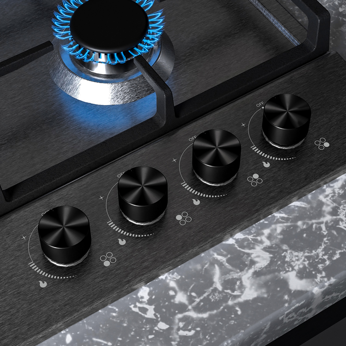 Газовая панель имеет механическое управление, которое позволяет легко регулировать интенсивность пламени с помощью ручек переключения.