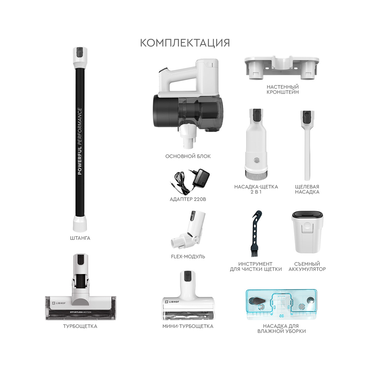 Основной блок, аккумулятор, пылесборник, настенный кронштейн, зарядное устройство, штанга, flex-модуль, турбощетка, щелевая насадка, насадка-щетка 2 в 1, мини-турбощетка, насадка для влажной уборки, инструмент для чистки щетки, руководство пользователя