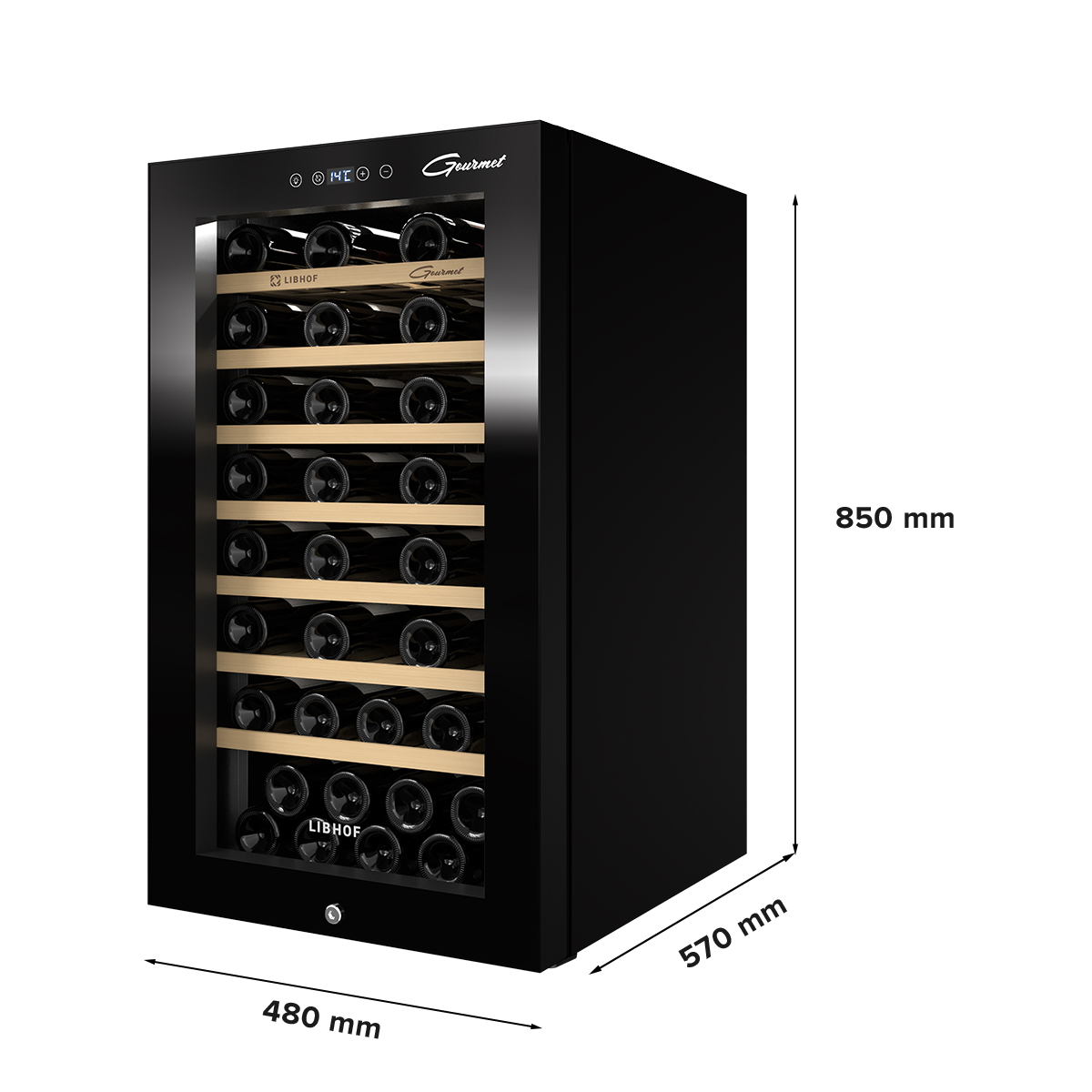 Отдельностоящий винный шкаф Libhof GM-56 black имеет одну зону охлаждения и позволяет регулировать температуру в диапазоне от 5 до 20 градусов, что делает его подходящим для хранения различных видов вин. Холодильник для вина оснащен 7 деревянными полками на которых помещается 56 бутылок типа бордо. Полки этого компрессорного винного холодильника изготовлены из массива бука, что помогает существенно уменьшить уровень вибраций от компрессора.