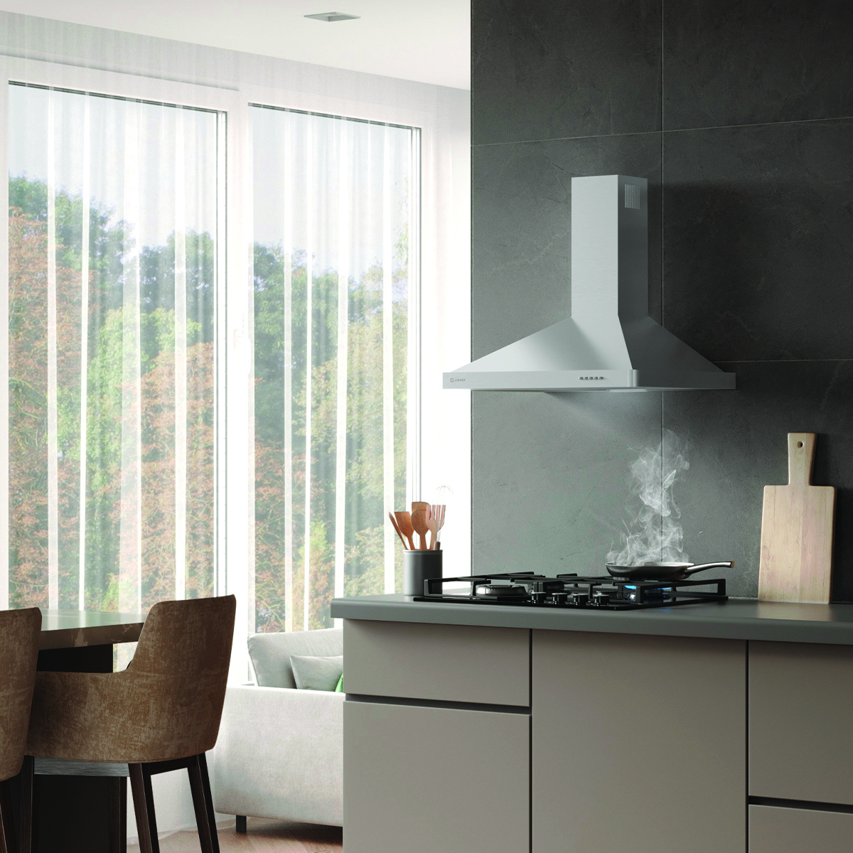 Вытяжка для кухни оснащена тремя скоростями работы, что позволяет легко регулировать её мощность в зависимости от интенсивности готовки и уровня загрязненности воздуха в кухне.