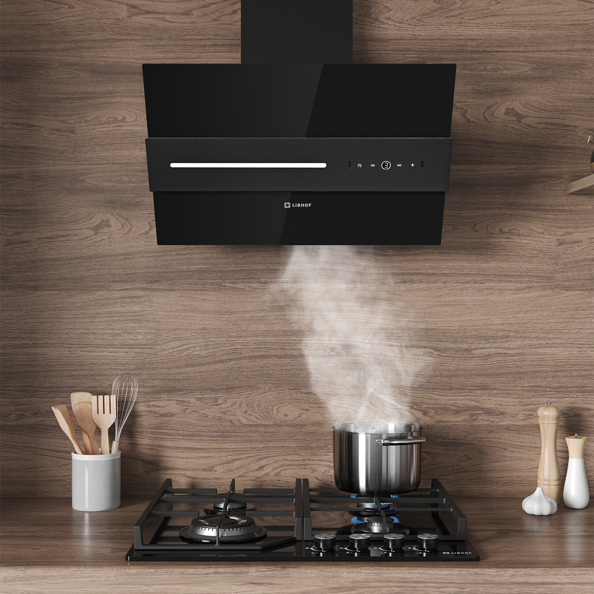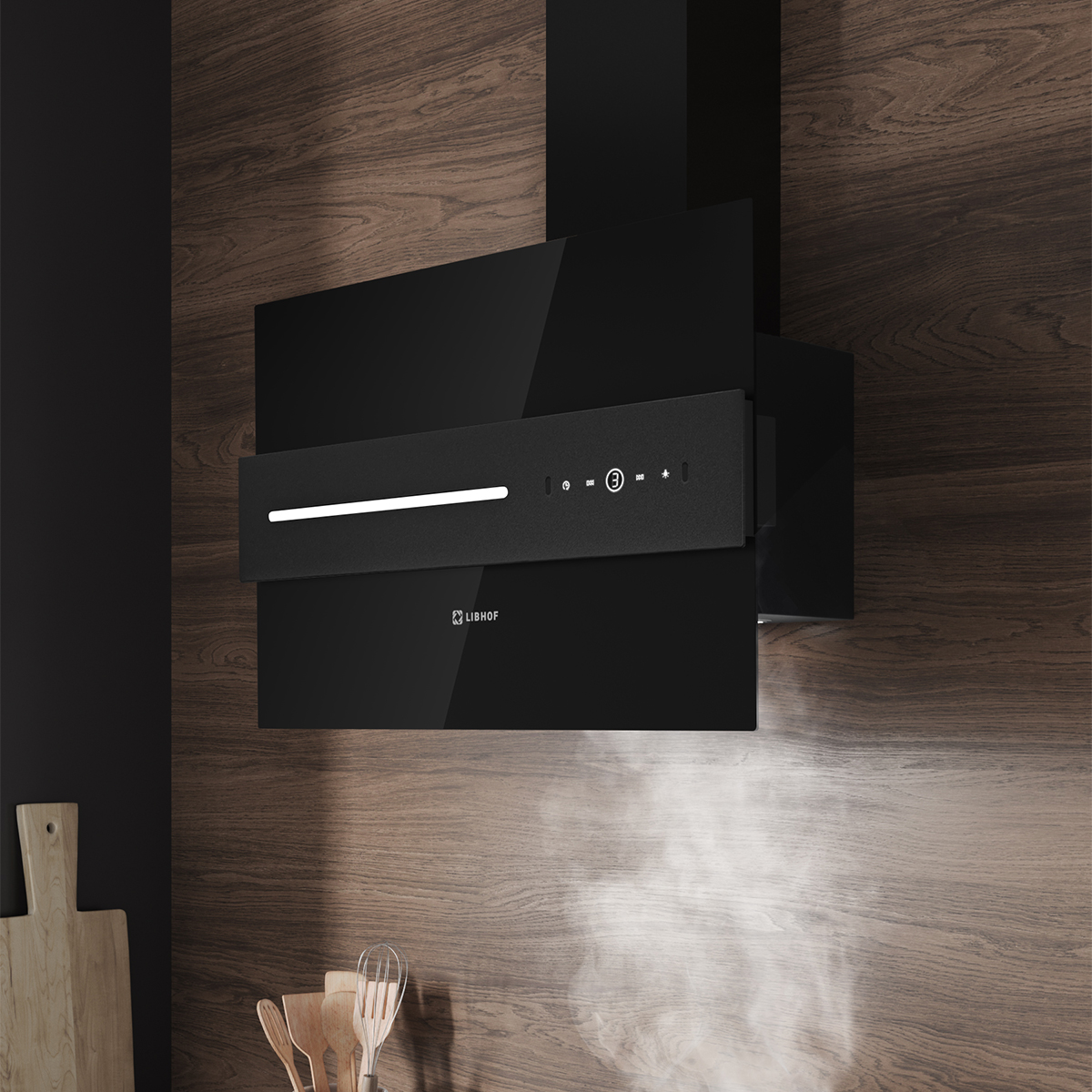 Мощность мотора в 230 ватт обеспечивает производительность отвода 1000 куб.м/час в помещениях площадью до 37 кв.м. Наклонная вытяжка для кухни имеет три скорости работы, что позволяет регулировать её мощность в зависимости от интенсивности готовки и уровня загрязненности воздуха в кухне. Современное LED-освещение, включающее две яркие лампы и дополнительную световую полосу на панели управления, создаёт равномерное освещение всей рабочей зоны. А управление вытяжкой осуществляется при помощи сенсорных кнопок или с помощью жестов.